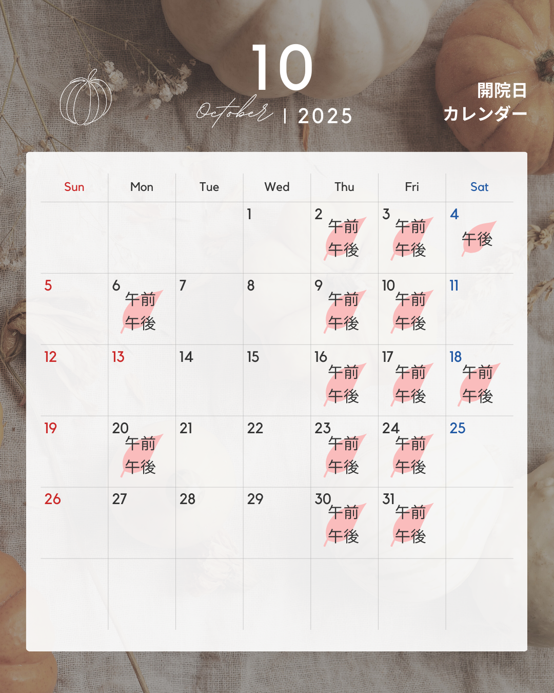 10月のスケジュール 2025年9月22日 最終更新日時 : 2025年9月22日 PASERI オステオパシー&整体朝晩が涼しくなり、体調を崩しやすい季節です。夏の疲れを整えて、秋を元気に過ごしましょう🍂オステオパシーで全身の巡りをサポートします✨🌿お知らせ🌿来月からサロンの開院時間が変わります✨曜日: 月・木・金 第1・3土曜 時間: 10:00〜17:30研修等で不定休あり「前より通いやすい!」と思っていただけたら嬉しいです☺️ご予約はこれまで通りLINEからどうぞ🌈